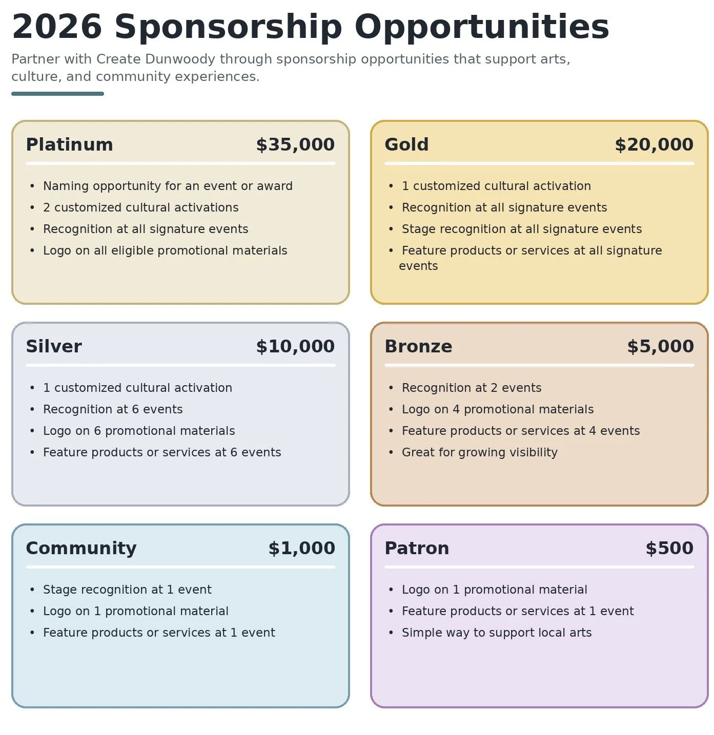 Donating to Create Dunwoody directly supports a range of impactful programs that enrich our community. Your contributions help fund creative activations, art exhibitions, and cultural initiatives that further our mission.